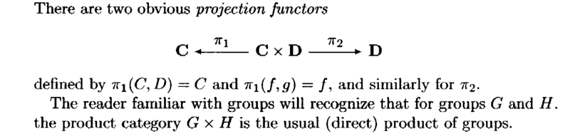 For the category Groups of groups and group homomorphisms, the product category of two categories ##C## and ##D##, namely ##C \times D##, has objects of the form ##(G,H)## where ##G## and ##H## are groups and where ##G \in C## and ##H \in D## ...