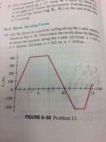 For part (a) and (b), I found the areas under or above the red line - that was fairly straightforward, BUT the professor added in his own part (c), that being to find the speed of the particle at each slope change and x-intercept. I am certain the solution to part (c) has something to do with the conservation of energy. I thought maybe the total work done on and by the particle would cancel each other out, and therefore I can set the conservation of energy equation to zero and solve for particle speed, and the mass (which is not given) would simple cancel out, but since the amount of work done on and by the particle are different areas on the graph, they don't cancel each other out. Therefore, I am left with two unknowns in my equation, that being the velocity and the mass. There is another equation I am not considering, I am sure of it.