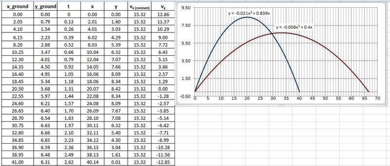 At t = 0, a projectile is located at the origin and has a velocity of 20 m/s at 40° above the horizontal. The profile of the ground surface it strikes can be approximated by the equation y = 0.4x – 0.006x2, where x and y are in meters. Determine: