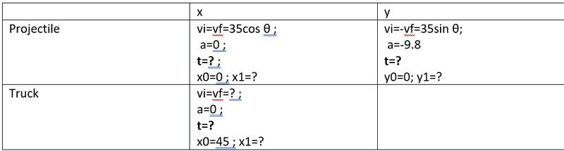 At first I thought that I can assume that the project tile hits the truck right at the position where y=0. My equation was: