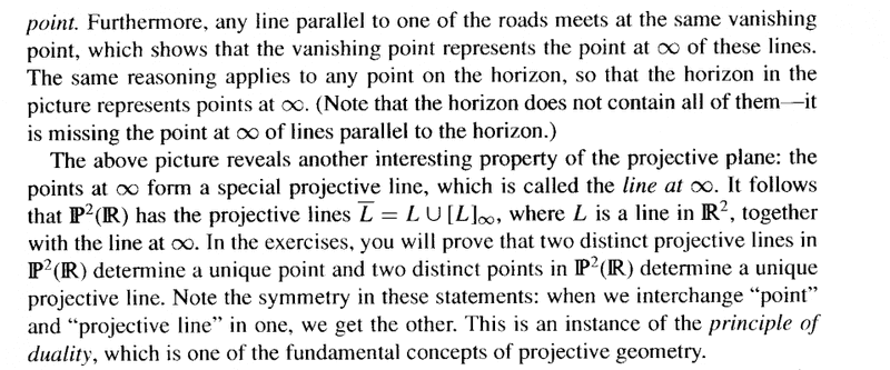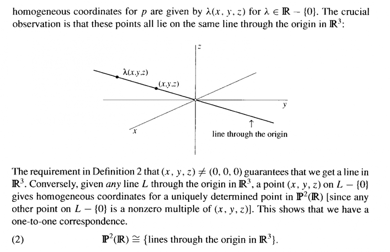 Definitions 1, 2, and 3 of Cox et al Section 8.1: The Projective Plane are relevant (see text below for Cox et al Section 8.1)
