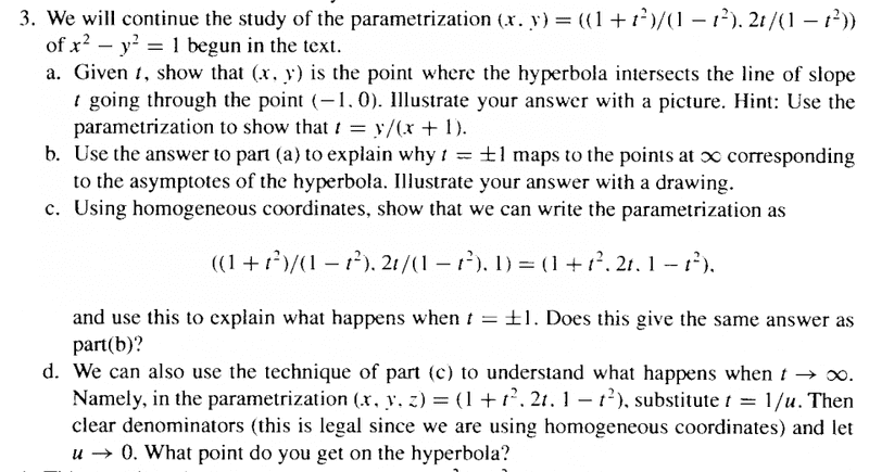Presumably, what is involved is not only (rigorously) showing that the equation ##x^2 - y^2 = z^2## is a well-defined curve in ##\mathbb{P}^2 ( \mathbb{R} )## but showing that ##x^2 - y^2 = z^2## is the representation in ##\mathbb{P}^2 ( \mathbb{R} )## of the curve ##x^2 - y^2 = 1## in ##\mathbb{R}^2## ... ... ?