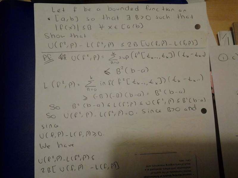 pasmith said:Your proof doesn't work: at one point you conclude that U(f^2,P) - L(f^2,P) = 0 which is not generally the case: consider f(x) = x on [a,b].