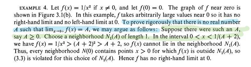 - Some participants reiterate that to prove the limit A does not exist, it is sufficient to provide a counterexample showing that terms near 0 map outside of any 1-neighborhood of a proposed limit A.