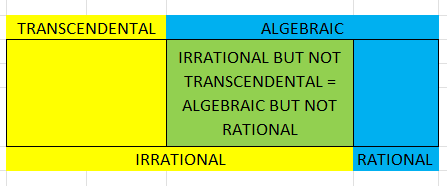 Here's my question. If transcendental numbers are all numbers that are not algebraic, how do we know that the disjoint union of the sets of algebraic numbers and transcendental numbers is exactly ##\mathbb R## and not an uncountable proper subset of it? (Here, I assume that ##\mathbb R## is defined as the completion of ##\mathbb Q##, or simply put, the disjoint union of the set of rational and irrational numbers).Properties