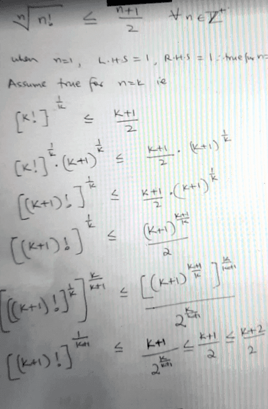 The discussion revolves around proving the inequality ##\sqrt[n]{n!} \le \frac{n+1}{2}## using mathematical induction. Participants emphasize the importance of correctly structuring the inductive step, specifically starting with the assumption ##\frac{1}{k} \log(k!) \le \log(\frac{k+1}{2})## rather than the inequality to be proven. The conversation highlights the necessity of proving intermediate steps, such as showing that ##2(k+1)^{k+1} \le (k+2)^{k+1}##, and suggests using the binomial theorem for clarity in the proof process.
