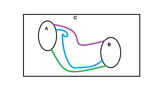 - any path between A and B must necessarily contain a point in C i.e. pass through C;