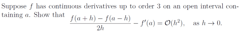 The discussion revolves around proving a relationship involving derivatives and Big O notation, specifically examining the expression ##\frac{f(a+h)-f(a-h)}{2h}-f'(a)=O(h^2)## as ##h \to 0##. Participants are exploring the implications of limits and the continuity of derivatives in this context.
