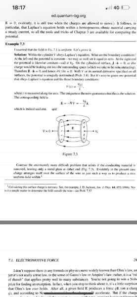 The discussion centers on the proof that the electric field (E field) inside a cylindrical resistor remains constant due to the nonconductive nature of the surrounding medium. It is established that because the surrounding medium has negligible conductivity, the charge flow at the surface does not have a component along the normal, leading to the conclusion that the E field along the normal must also be zero. The confusion arises from the assumption that a non-zero E field could exist without causing charge flow, which contradicts the principles of electrostatics.