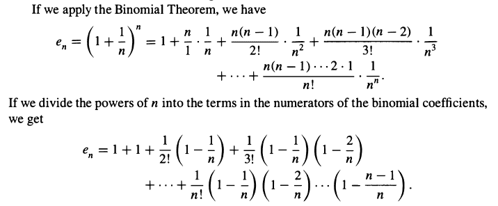 (1 + 1/n)^n = 1 + sum(k=1 to n) [1/k! product(r=0 to k-1) (1 - r/n)]