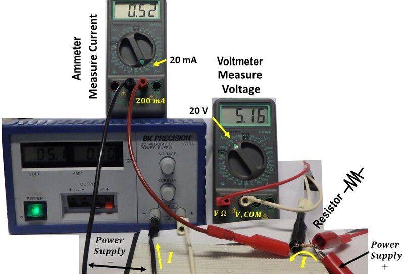V=IR is Ohm’s Law here for the simple circuit below. I am predicting what the voltage across the resistor should be given a measured current through a measured resistance, and then measuring that voltage directly for comparison.