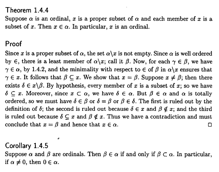 "... ... Moreover, since ##x \subset \alpha##, we have ##\delta \in \alpha##. But ##\beta \in \alpha## and ##\alpha## is totally ordered, so we must have ##\delta \in \beta## or ##\delta = \beta## or ##\beta \in \delta## ... ... "My question is regarding the three alternatives ##\delta \in \beta## or ##\delta = \beta## or ##\beta \in \delta## ... ...Now ... where ##(S, <)## is a partially ordered set ... ##S## is said to be totally ordered by ##<## if and only if for every pair of distinct members ##x, y \in S##, either ##x < y## or ##y < x## ... ..So if we follow the definition exactly in the quote above there are only two alternatives ... ##\delta \in \beta## or ##\beta \in \delta## ... ...