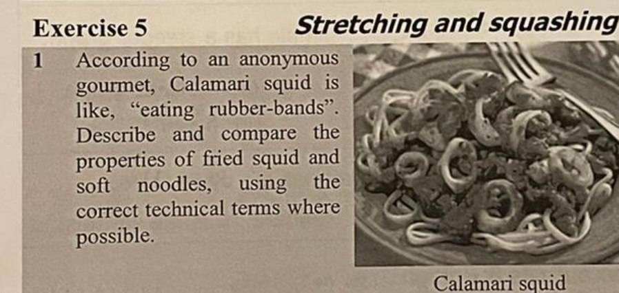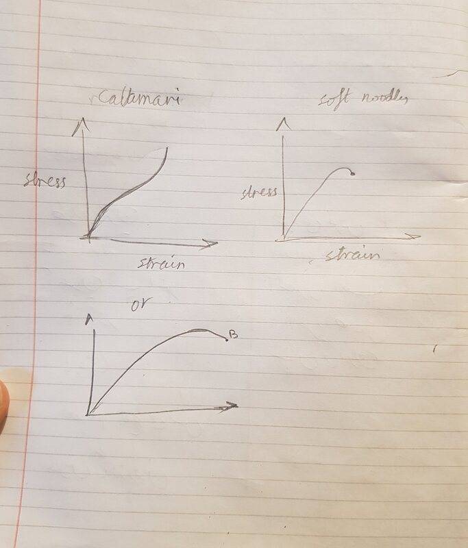 I understand that soft noodles is not as strong as calamari squid and breaks easily . I also know that that calamari squid does not have elastic behaviour since behaves like rubber band and it goes back to it's original shape after reloading. But I'm still very confused about answering this question.