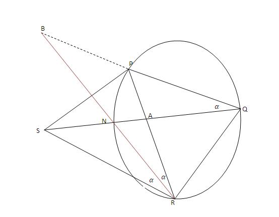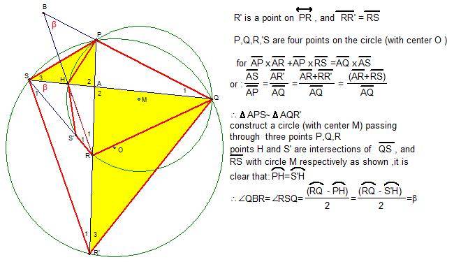 The discussion centers on proving that $\angle QBR=\angle RSQ$ in a convex quadrilateral $PQRS$ where the diagonals $PR$ and $QS$ intersect at point $A$. The proof relies on the angle bisector of $\angle PRS$ intersecting line $QP$ at point $B$, and the condition $AP\cdot AR + AP\cdot RS = AQ\cdot AS$. The use of the "Power of a Point Theorem" is highlighted as a crucial tool in understanding this geometric relationship.