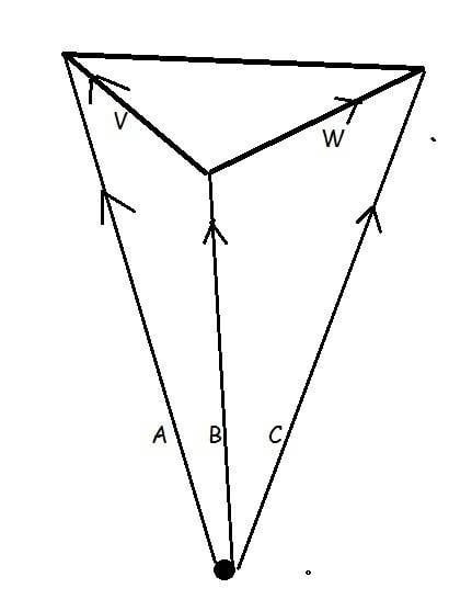I know that the magnitude of the cross product of any two vectors gives the area of the parallelogram formed by those two vectors, and taking half of that would give the area of the triangle. I can see how 1/2|BxC|+1/2|CxA|+1/2|AxB| could give the total area of the triangle formed by the three points, because that would give the sum of the areas of the triangles formed by all 3 possible pairs of vectors which would equal the area of the triangle formed by all 3 vectors. I don't believe that this is the same thing as 1/2|(BxC)+(CxA)+(AxB)|. Not sure where to go from here.