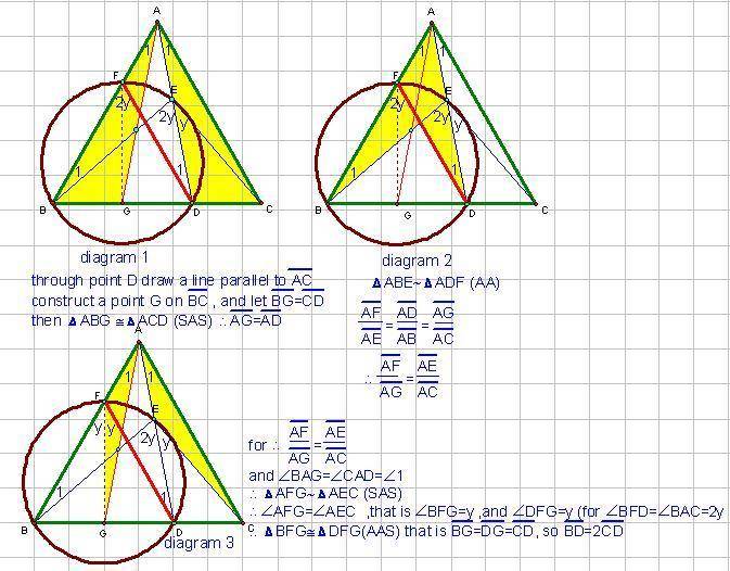 $\dfrac{AB}{\sin(180^{\circ}- 2\alpha)}=\dfrac{AE}{\sin \theta}$ and $\dfrac{AC}{\sin(180^{\circ}- \alpha)}=\dfrac{AE}{\sin(\alpha-\theta)}$
