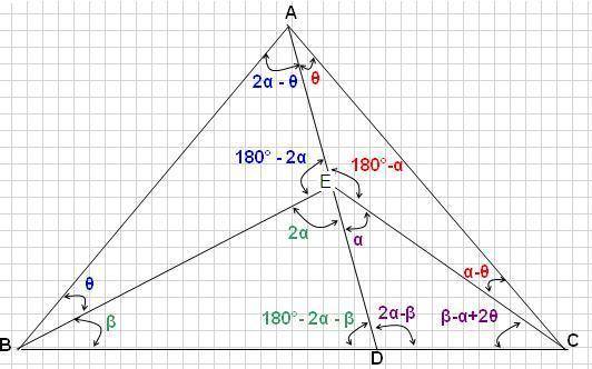 $\dfrac{ED}{\sin \beta}=\dfrac{BD}{\sin 2\alpha}$ and $\dfrac{ED}{\sin(\beta-\alpha+2\theta)}=\dfrac{CD}{\sin \alpha}$