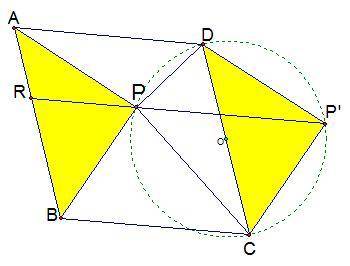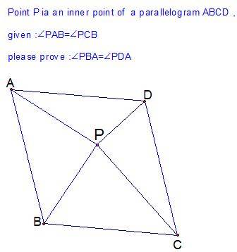 The discussion focuses on proving that the angles $\angle PBA$ and $\angle PDA$ are equal in a parallelogram ABCD, given that point P is an interior point with $\angle PAB = \angle PCB$. By constructing lines P'C parallel to PB and P'P parallel to BC, two parallelograms, BCP'P and APP'D, are formed. The cyclic nature of points C, P'D, and P leads to the conclusion that $\angle DPP' = \angle DCP'$, which directly establishes the equality $\angle PBA = \angle PDA$.