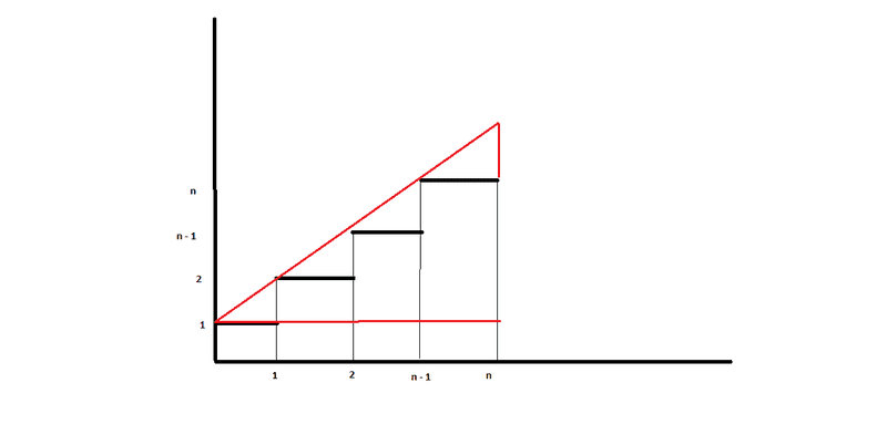 each sub interval has base 1 and height 1, 2 , ... n respectively...