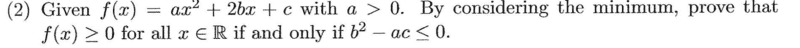 - Participants discuss the relationship between the minimum value of the function and the condition \( b^2 - ac \leq 0 \). There are attempts to express the minimum value in terms of \( a \), \( b \), and \( c \), and to understand how the hypothesis \( a > 0 \) influences the proof. Some participants question how to apply the condition effectively and explore the implications of the minimum value being non-negative.