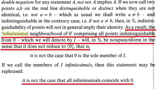 Now if the Law of Double Negation (or, equivalently, the Law of Excluded Middle) held in ##S##, we could infer that ##x = 0## for each ##x## in ##I(0)##, so that the infinitesimal neighbourhood of ##0 I(0)## would reduce to ##\{ 0 \}##. But we know that this neighbourhood does not reduce to ##\{ 0 \}## in S. So we cannot infer the identity of points from their inddistinguishability. Again, suppose there is a point ##a## in ##I## that is distinguishable from 0, i.e. suppose there is a point ##a## in ##I## such that ##\lnot a = 0##.But since ##a## in ##I##, ##\lnot \lnot a = 0## by definition. But this is a contradiction. Therefore it is not the case that there exists a point ##a## in ##I## that is distinguishable from 0.