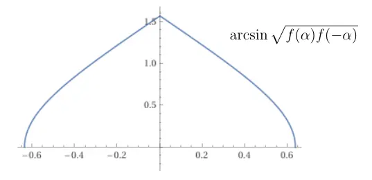 I&=2\int_{\alpha=0}^{\alpha=a}\sqrt{f(\alpha)f(-\alpha)}\dfrac{d}{d\alpha}\left(\dfrac{\alpha}{\sqrt{1-f(\alpha)f(-\alpha)}}\right)\,d\alpha