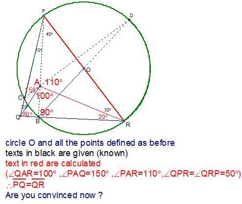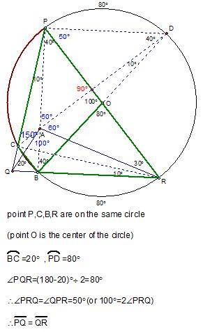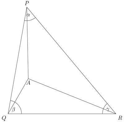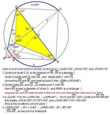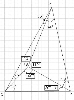 There is an interior point $A$ such that $\angle APQ=10^{\circ}$, $\angle AQP=20^{\circ}$, $\angle ARP=30^{\circ}$ and $\angle APR=40^{\circ}$.