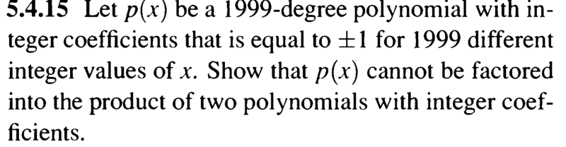 The discussion revolves around the challenge of proving that a polynomial cannot be factored into polynomials with integer coefficients. The original poster explores the properties of a 1999-degree polynomial and its behavior at integer values, particularly focusing on the polynomial's values being ±1.
