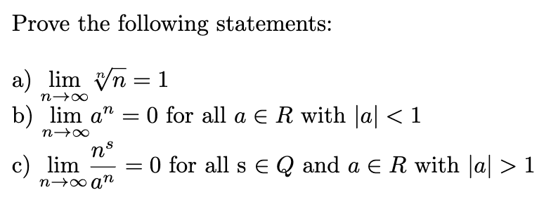 I now wanted to prove three tasks with a direct proof, e.g. for task a)$$\sqrt[n]{n} = n^{\frac{1}{n}}= e^{ln(n^{\frac{1}{n}})}=e^{\frac{1}{n}ln(n)}$$