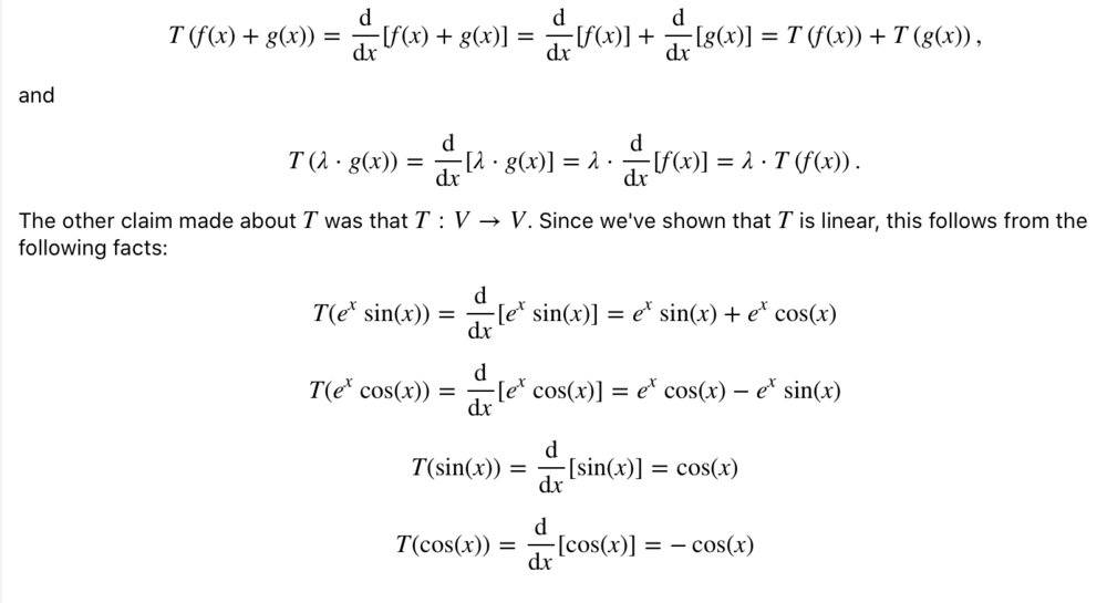 - Others express confusion about the necessity of including trigonometric functions in their proofs and whether the differential operator's linearity applies to the specific subspace \( V \).