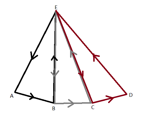 $(\oint_{ABE}+\oint_{BCE}+\oint_{CDE}){ \overrightarrow{F} }d \overrightarrow{R}=\oint_{ABCDE}{\overrightarrow{F}}d \overrightarrow{R}+\int_B^E{\overrightarrow{F}}d \overrightarrow{R}+\int_E^B{\overrightarrow{F}}d \overrightarrow{R}+\int_C^E{\overrightarrow{F}}d \overrightarrow{R}+\int_E^C{\overrightarrow{F}}d \overrightarrow{R}=\oint_{ABCDE}{\overrightarrow{F}}d \overrightarrow{R}$