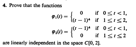 We are required to show that ##\alpha_1 \varphi_1(t) + \alpha_2 \varphi_2(t) = 0## for some ##\alpha_1, \alpha_2 \in \mathbb{R}## is only possible when both ##\alpha_1, \alpha_2 = 0##.