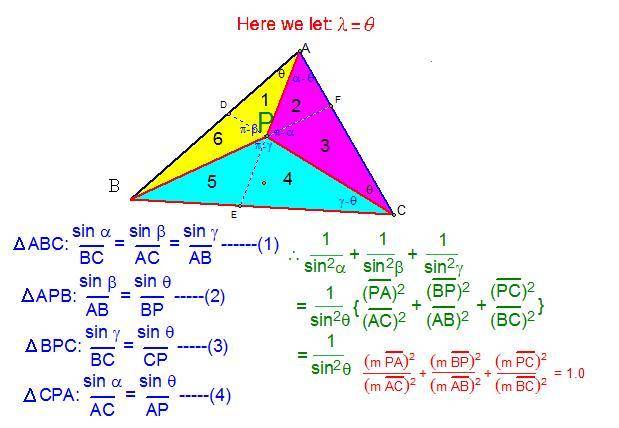 $\therefore \dfrac{\sin^2 \lambda}{\sin^2 \beta}=\dfrac{\text{area of the triangle BPC}}{\text{area of the triangle ABC}}$