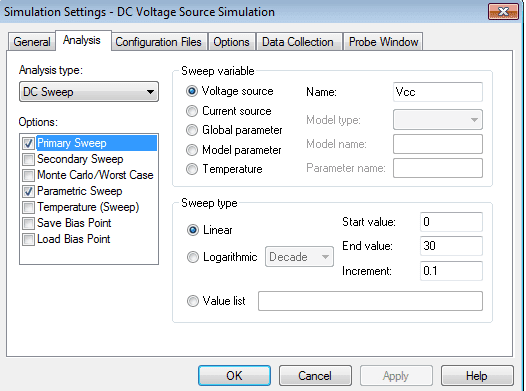 I'm trying to run a parametric sweep of the voltage source. I'm running it from 0V to 30V with a 0.1V interval