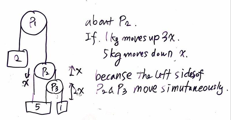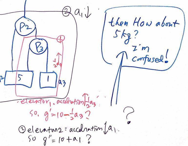 There is mention of confusion regarding the equations of motion due to the presence of the 5kg mass and its connections to multiple pulleys. Participants are also considering the implications of the system's constraints on the accelerations and tensions involved.