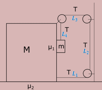 Question :- Find the acceleration of block of mass ##M##. The coefficient of friction between blocks is ##\mu_1## and between block and ground is ##\mu_2##.