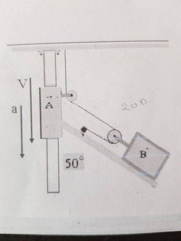 - Suppose that at the instant depicted in the figure, ##A## has a velocity of ##-400 cm/s## and an acceleration of ##-16 cm/s^2##. The motion of ##A## and the motion of ##B## are related by the pulley and cord system. Determine ##\vec v_{B/A}, \vec a_{B/A}, \vec v_{B/Earth}, \vec a_{B/Earth}## and the normal acceleration of ##B## with respect to Earth.