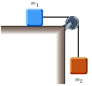 In case you don't feel like looking at the picture, there are two masses connected by a frictionless pulley- m1 is on the table, m2 is hanging off the table.