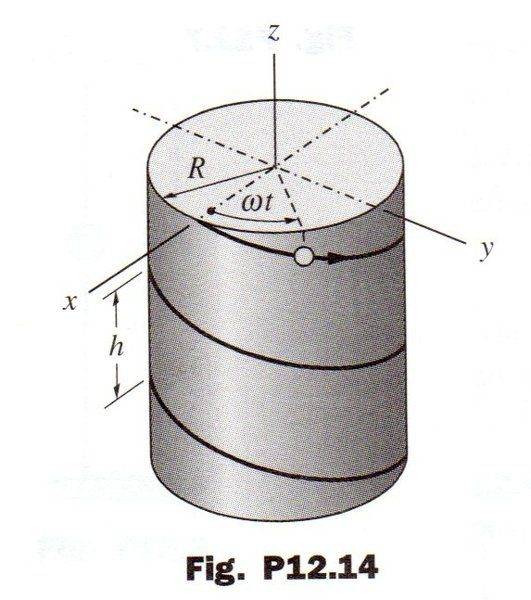 The problem involves a particle moving along a helix, with its position vector defined by specific equations for x, y, and z components. The task is to demonstrate that the velocity and acceleration of the particle maintain constant magnitudes and to compute these values given certain parameters.