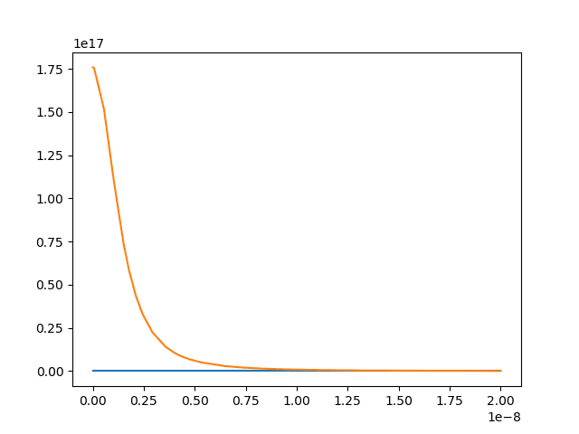a = solve_ivp(d2vdt2,(0, 20*10**(-9)), (0,e*E/m),"Radau")