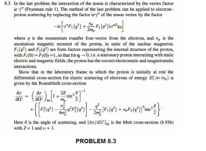 - In problem 8.3 of Mandl & Shaw's book "Quantum Field Theory" I have to derive the Rosenbluth cross section for the electron-proton scattering that I post on the image. I tried but I can't get to the result because the accounts are too complicated for me. Does anyone know a solution or book where they do the accounts step by step? Or perhaps someone has done this account and can post the solution?