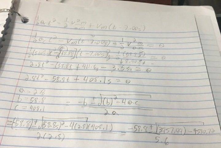 ((1/2)act^2=(1/2)(vm^2/am)+(t-7.00s)