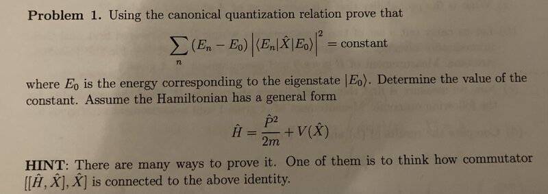 The problem involves quantum mechanics, specifically focusing on the relationship between operators and their commutators within the context of canonical quantization. The original poster seeks assistance in understanding how the commutator relates to a specific identity involving energy eigenstates.