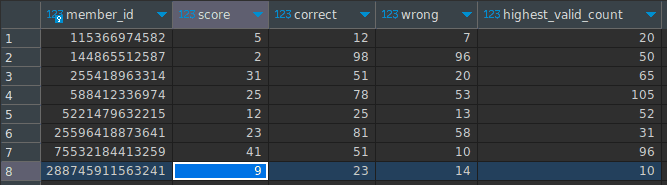 score column, and then retrieve the row position of that particular member id. This is my query in MySQL:[CODE lang="sql" title="MySQL"]SET @rowNum := 0;