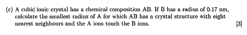 - Participants discuss methods for calculating the radius of ion A by utilizing the diagonal of a square and the geometry of the cubic structure. There are questions about the number of nearest neighbors and the implications of different crystal structures.