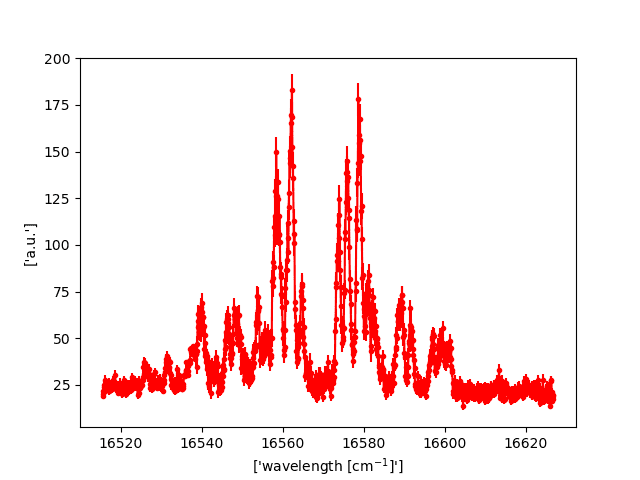 Hello! I have the spectra below measured, which shows transitions from a ##^{2}\Sigma_+## electronic level (the ground state) to an excited ##\Omega=3/2## level (there are several other level around it, so I decided that using Hund case c would be better, than Hund case a, but in Hund case a this state would be mainly ##^{2}\Pi_{3/2}##). I know the molecular constants of the ##^{2}\Sigma_+## state and I would like to get some values for the excited state. The resolution is not great, so I don't expect really accurate values, but ideally I would like to fit something of the form: $$T_{3/2}+B_{3/2}J(J+1)+D_{3/2}[J(J+1)]^2$$