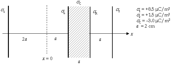 Two infinite sheets with surface charge density σ1 and σ2, respectively, are oriented perpendicular to the x-axis. An infinite, conducting slab of thickness a is placed between the charged sheets as shown in the figure. The conducting plate has a net charge per unit area of σC.