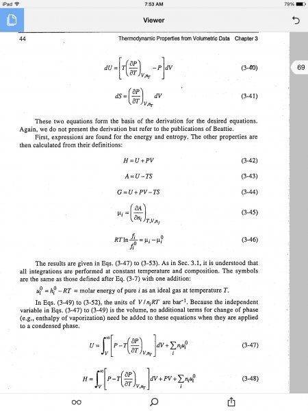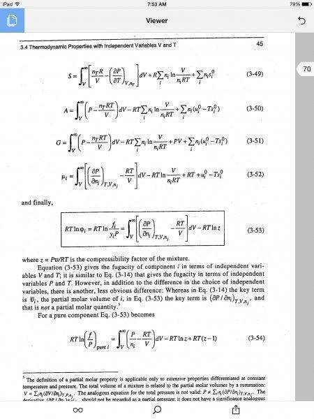 This discussion focuses on the derivation of thermodynamic properties, specifically addressing terms from equations 3-47, 3-49, and 3-41 in the context of ideal gas mixtures. The integration from finite specific volume to infinite is clarified as necessary for correcting properties at finite volumes. Additionally, the discussion highlights the significance of analytical functions in deriving chemical potential expressions for pure substances at a given temperature relative to a reference state.