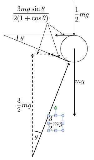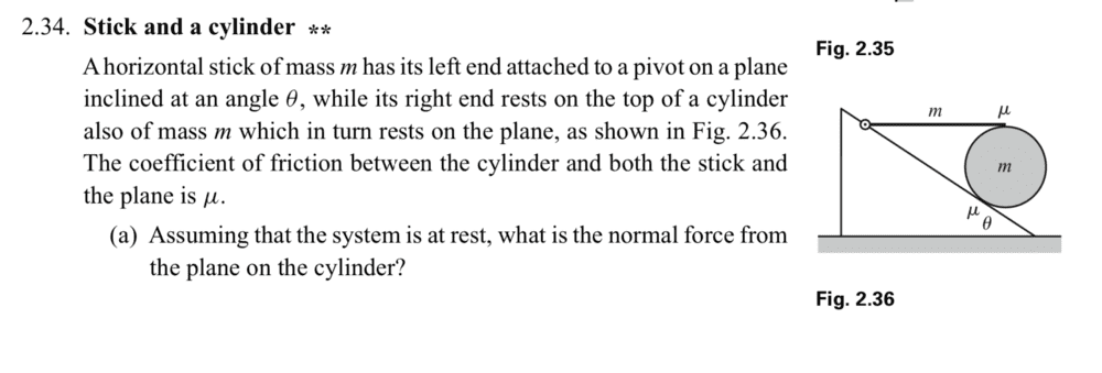 - A horizontal stick of mass m has its left end attached to a pivot on a plane inclined at an angle θ, while its right end rests on the top of a cylinder also of mass m which in turn rests on the plane, as shown in Fig. 2.36. The coefficient of friction between the cylinder and both the stick and the plane is μ.