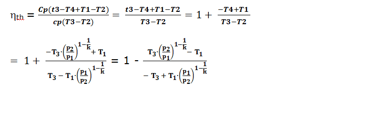 &= 1 - \frac{T_3 \left( \frac{p_2}{p_1} \right)^{-\left(1 - \frac{1}{k} \right)} - T_1}{T_3 - T_1 \left( \frac{p_2}{p_1} \right)^{\left(1 - \frac{1}{k} \right)}} \\
